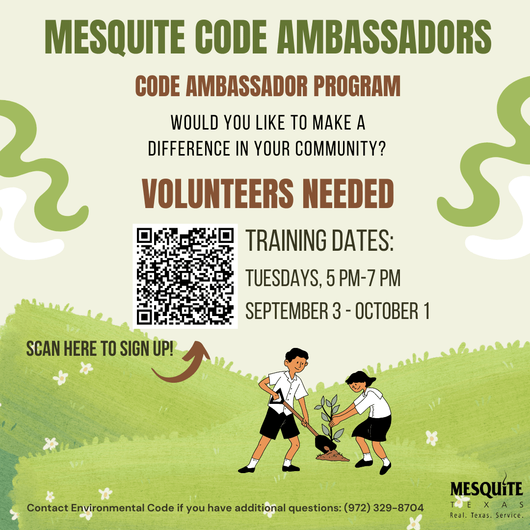For more information, visit www.cityofmesquite.com/CodeAmbassadors or call 972-329-8704, or sign up here: https://bit.ly/3yM0wwa.